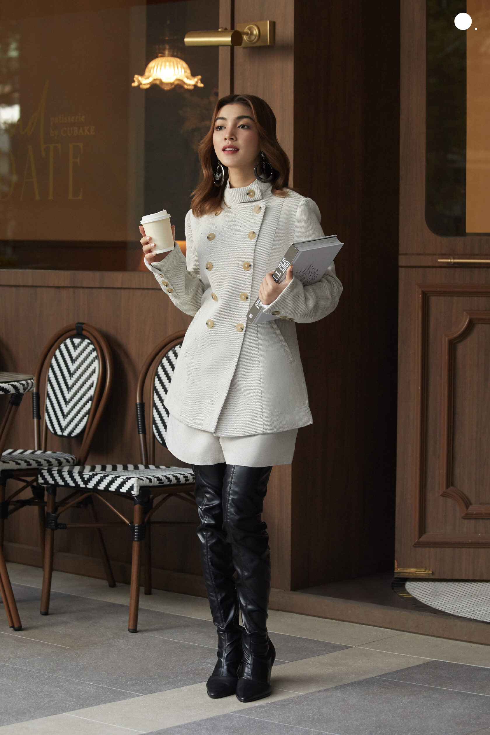 Jacket, blouse, trousers, boots, bag, and earrings: all Emporio Armani