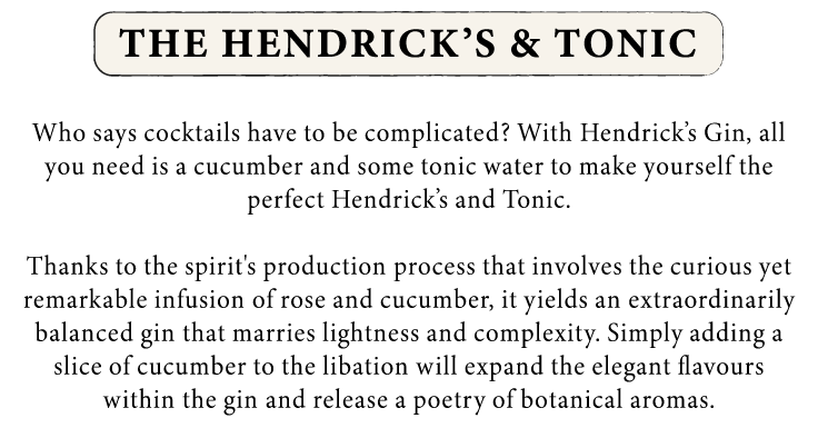 Wander the Hendrick's universe in search of a special cucumber, capture a selfie with it, post it on your Instagram Stories and tag @hendricksginsea. The five most creative submissions will reap handsome rewards with a crate full of Hendrick's & Tonic essentials**.